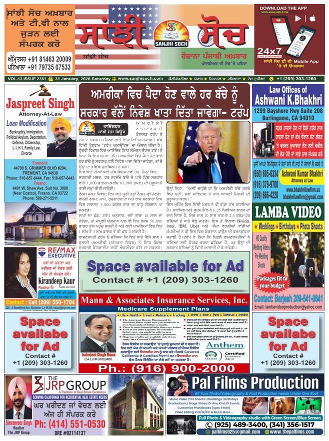 ਪੰਜਾਬੀਆਂ ਦੀ ਧੜੱਲੇਦਾਰ ਆਵਾਜ਼ ‘ਸਾਂਝੀ ਸੋਚ’ ਅਖ਼ਬਾਰ ਵਿਚ ਇਸ਼ਤਿਹਾਰ, ਲੇਖ, ਖ਼ਬਰਾਂ ਤੇ ਹੋਰ ਸਮੱਗਰੀ ਦੇਣ ਵਾਸਤੇ ਸਾਨੂੰ ਸੰਪਰਕ ਕਰੋ।
